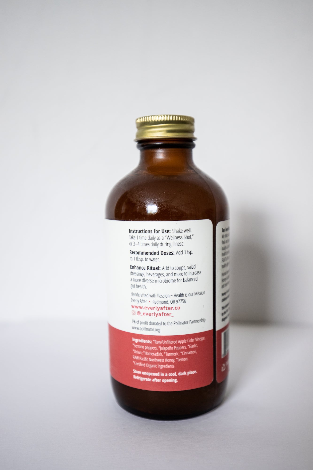 Ingredients: *Apple Cider Vinegar, *Serrano peppers, *jalapeño peppers *garlic, *onion, *horseradish, *turmeric, *cinnamon, local RAW Honey.